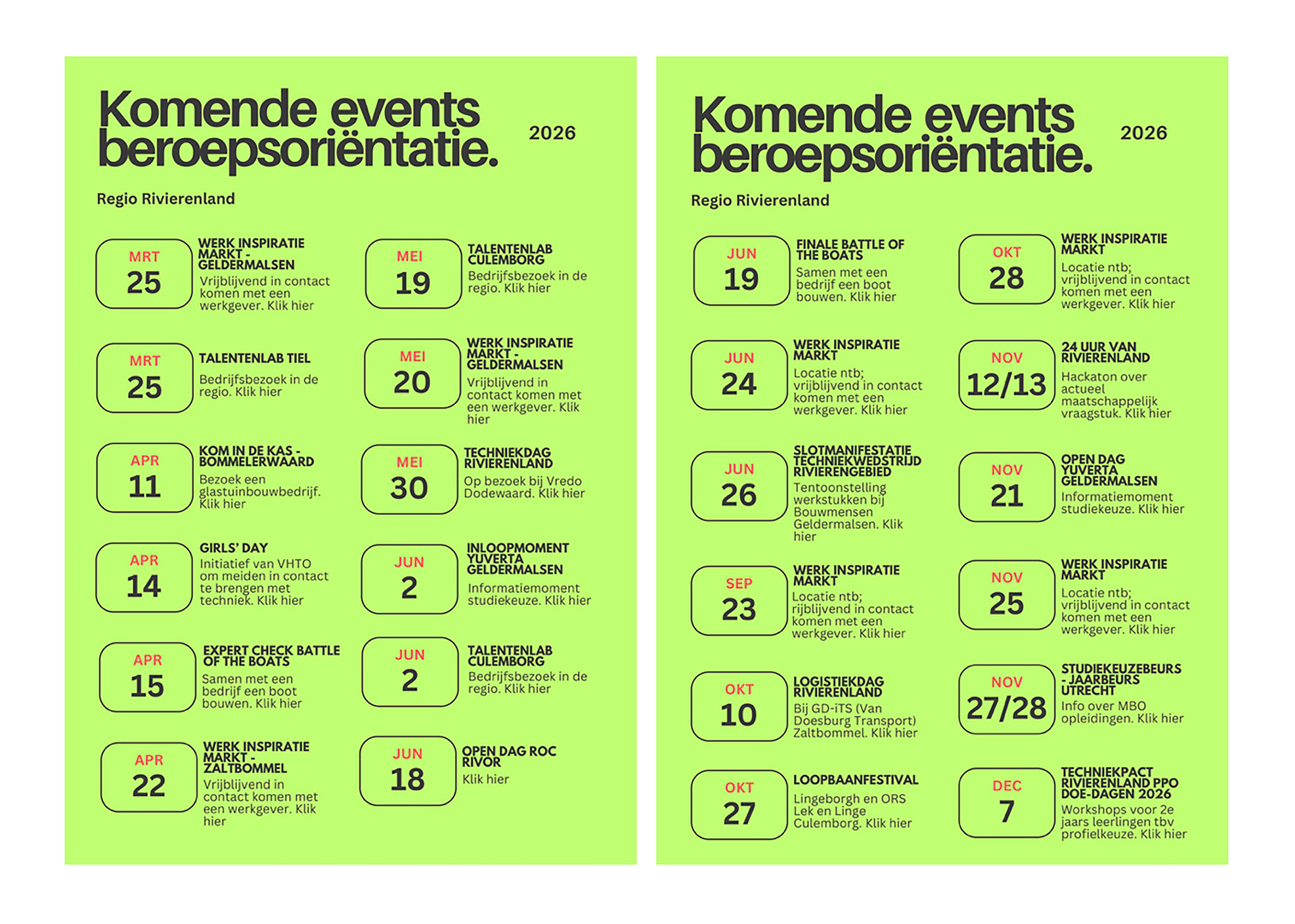 Hieronder vind je de jaarkalender met een overzicht van de activiteiten in Rivierenland voor vmbo en mbo studenten, gericht op hun beroepsoriëntatie. Voor ieder wat wils en zo volledig mogelijk.