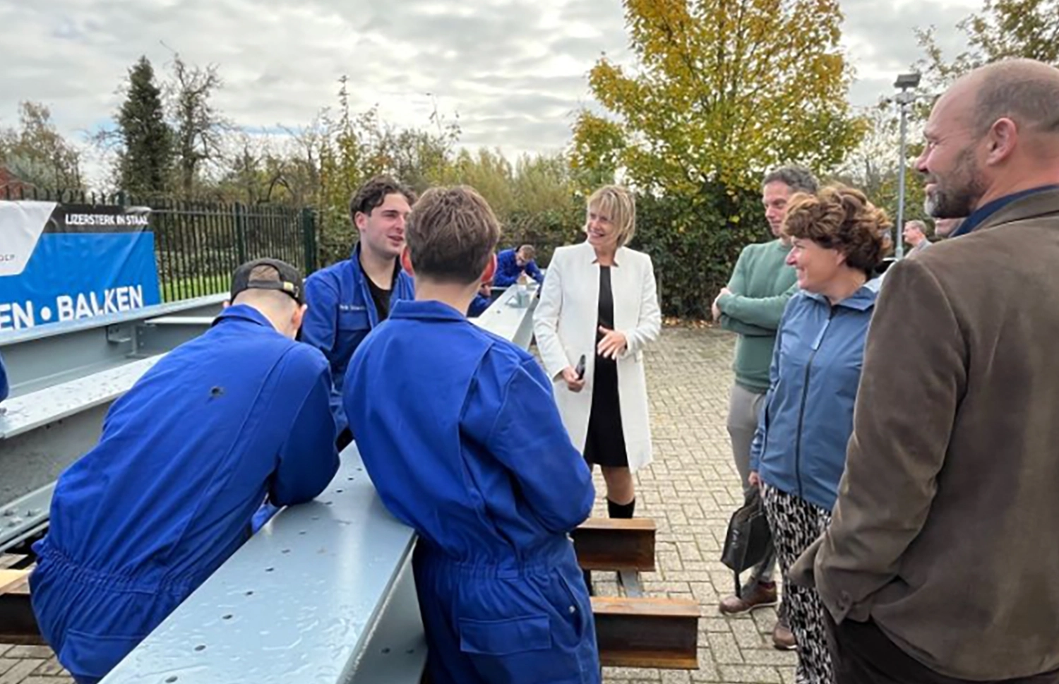 Helga Witjes, gedeputeerde van de provincie Gelderland, bracht een bezoek aan studenten Metaal van ROC Rivor. Onze studenten werken namelijk in opdracht van de provincie aan een circulaire fietsbrug in Nijkerk. Een bijzonder project waarbij overheid, onderwijs en bedrijfsleven samenwerken en duurzaamheid centraal staat.
